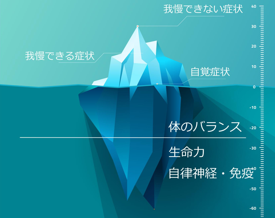 コリや痛み、頭痛やむくみ等、今実際に感じている「自覚症状」は、実はお身体全体でみてみると氷山の一角でしかありません。